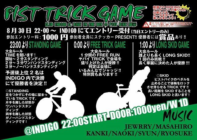 4月以来となる熊本PISTイベントが8月末に決まったようです。今回はスタンディング、SKIDに加えハードトリックを決めた者が勝ちのTRICK GAMEなるものも追加。鹿児島、佐世保からのエントリーがあれば危険度アップ間違いなしでしょう。もちろん辛島localもゲリラ的に乗り、飲みで参加予定です