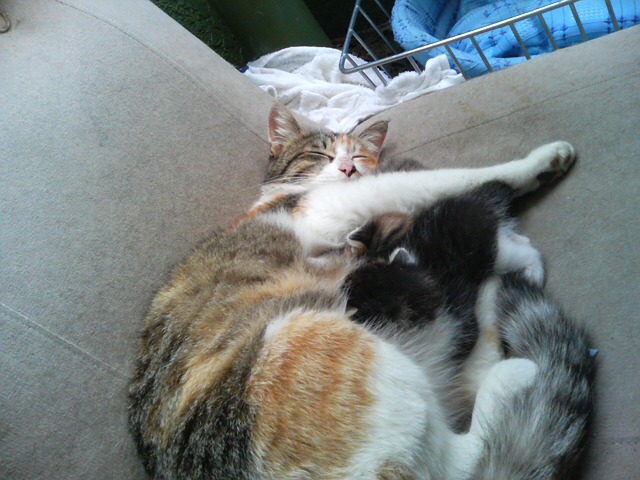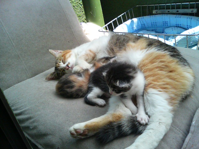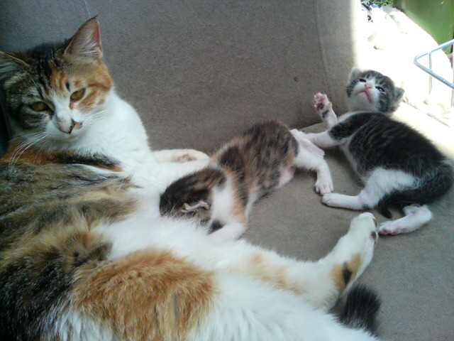 ひと月ほど前のことですがウチのベランダに置いてる座椅子で野良ねこが子猫を産んでました。最初は目も開いてなく動きも頼りなかったのに今ではすかっり母ねこの存在を理解しています、毎日目ヤニを掃除してやってたのが昔のことのように感じます。走り回ってウチのベランダがにぎやかになるのも時間の問題です