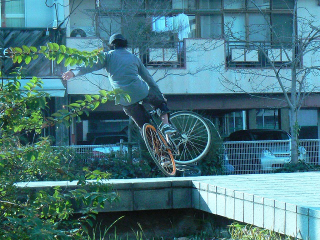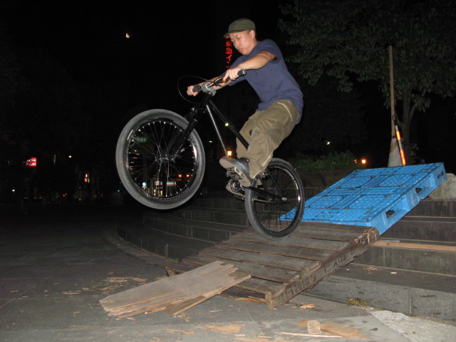 画像は24に拘るシゲ。バニーホップで入ってマニュアルで捲くれるのを期待するも危なげなくメイク。最近は縁石やバンク、ウォールとストリートでも少しずつ乗るようになってきたので自信が付けば一皮剥けそう。bmx、mtb関係なくやる気のないやつを蹴散らして刺激を与えて欲しいとこ。ストリートでモッサリした動きはかなり不利、一刻も早くリジットフォークを